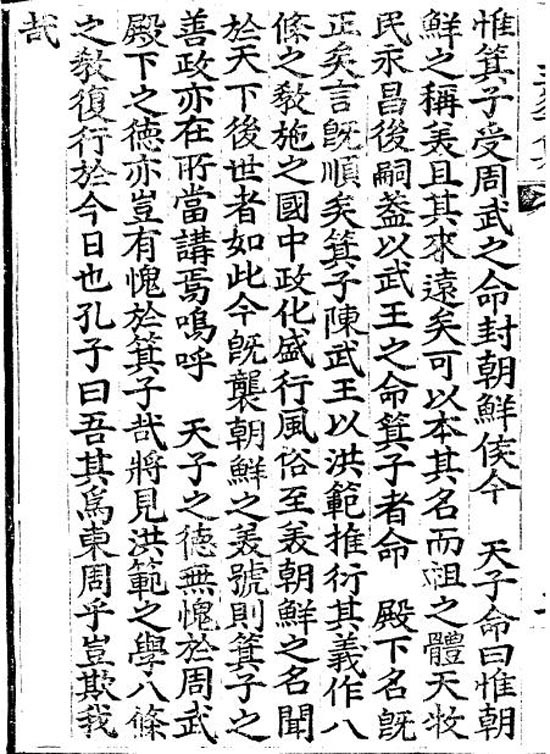 기자는 무왕에게 홍범을 설명하고 그 뜻을 부연하여 8조의 가르침을 지어서 나라 안에 실시하니, 정치와 교화가 성하게 행해지고 풍속이 지극히 아름다웠다. 그러므로 조선이란 이름이 천하 후세에 이처럼 알려지게 된 것이다. 이제 조선이라는 아름다운 국호를 그대로 사용하게 되었으니, 기자의 선정 또한 당연히 강구해야 할 것이다. 아! 명나라 천자의 덕도 주 무왕에게 부끄러울 게 없거니와, 전하의 덕 또한 어찌 기자에게 부끄러울 게 있겠는가? 장차 홍범의 배움과 8조의 가르침이 금일에 다시 시행되는 것을 보게 되리라>>