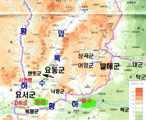 그런데 위 유주에 속한 10개 군의 위치를 지도에 표시해보면 이상스럽게도 아래와 같이 산서성 남부와 황하북부 하남성 일대로 나타난다. 독자들은 어안이 벙벙해지며 “그곳은 대대로 중국의 땅이었으므로, 중국의 주장대로 중국에서 유주자사를 지낸 한 관리가 고구려로 망명해 살다가 광개토태왕 때 죽어 한반도에 묻혔나?”라고 생각할지도 모른다. 과연 그런 중국의 주장이 옳을까?